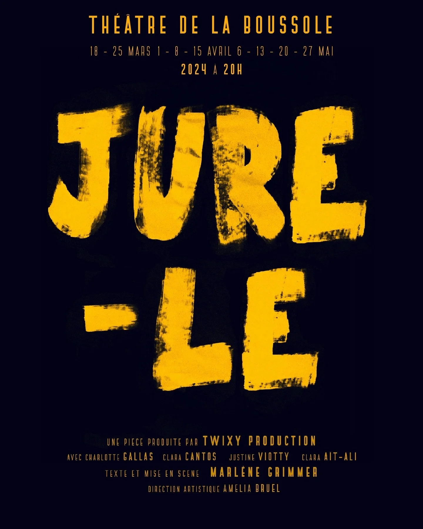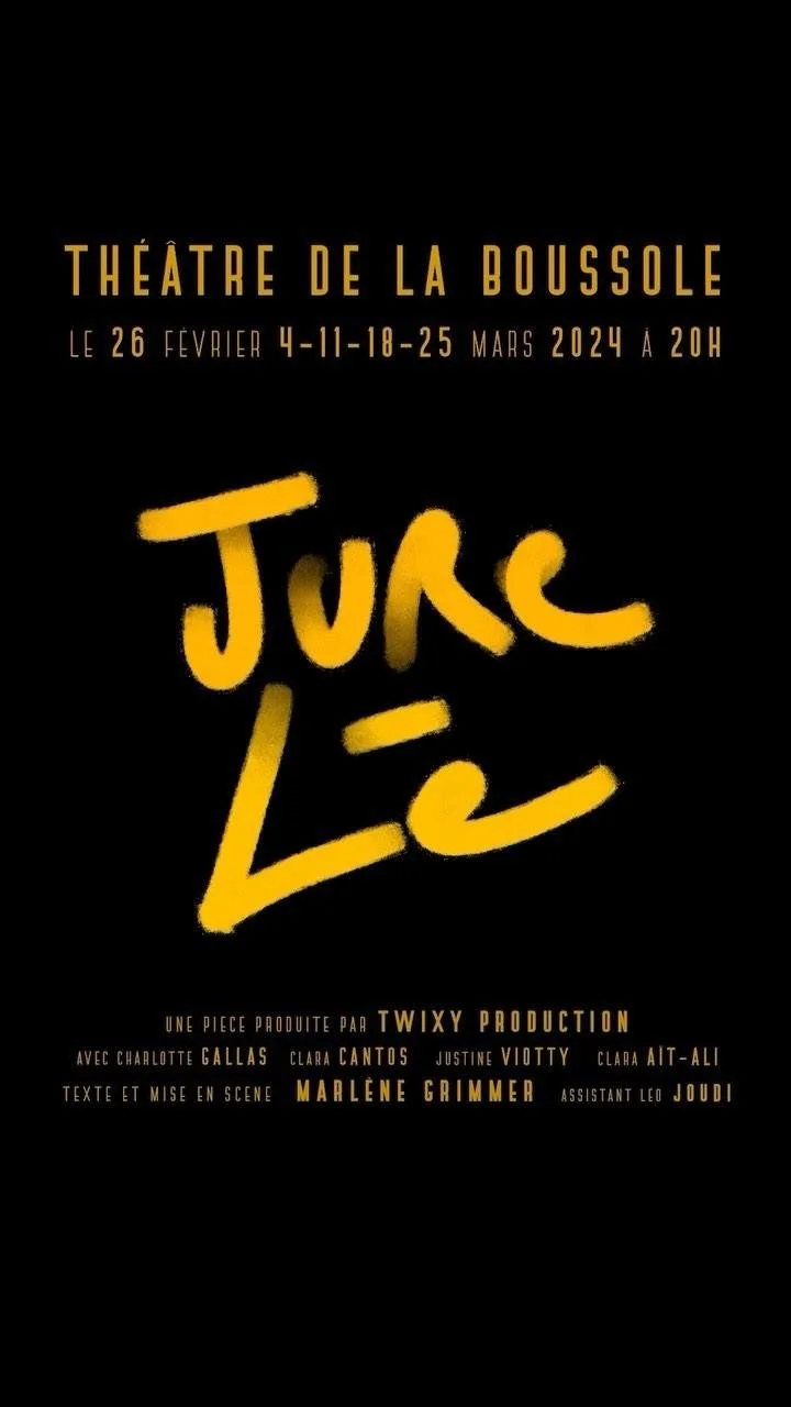 J’AI EU LE PRIVILÈGE DE TRAVAILLER COMME DIRECTRICE ARTISTIQUE ET COMMUNITY MANAGER POUR LA PIÈCE DE THÉÂTRE "JURE-LE", ÉCRITE ET MISE EN SCÈNE PAR MARLÈNE GRIMMER, AVEC CHARLOTTE GALAS, CLARA AÏT-ALI, CLARA CANTOS ET JUSTINE VIOTTY.